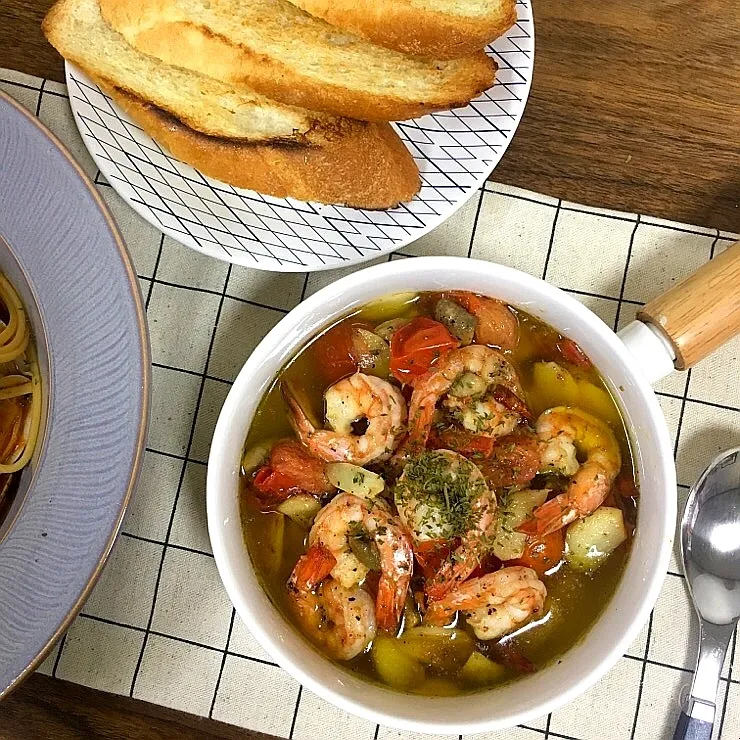 새우 20마리(380g), 올리브 오일 1컵, 마늘 12쪽, 페페론치노 또는 베트남 고추 6~7개, 파슬리, 소금, 후추