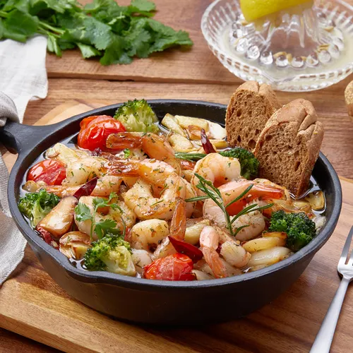 감바스 알 아히요는 올리브 오일에 풍성하게 볶은 새우와 향이 진한 마늘로 만들어진 스페인의 전통적인 전채 요리로 잘 알려져 있습니다. 새우는 필요에 따라 다양한 스타일의 새우 칵테일로 대체할 수 있고, 올리브 오일 대신 카놀라유를 사용하는 것도 가능합니다. 청양고추를 사용하는 대신 페페론치노를 넣어 조리할 수도 있습니다.