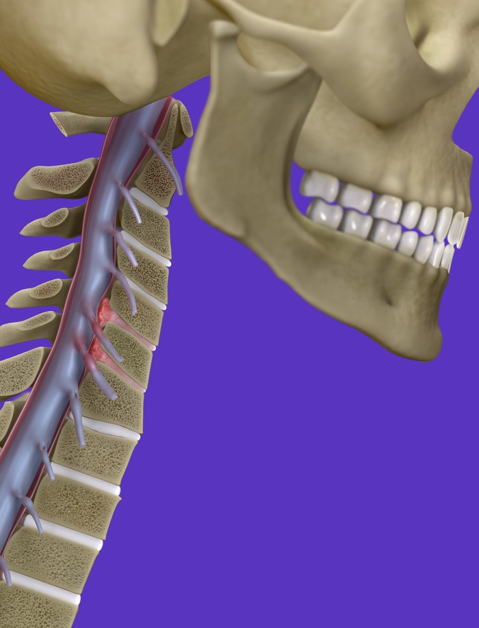 직접적인 신경 압박 여부를 확인하려면 추가 정밀 검사가 필요합니다. 컴퓨터 단층 촬영(CT) 스캔은 척수의 횡단면을 검사하여 추간판, 척추관의 크기, 석회화된 병변을 평가하는 데 유용합니다. 그러나 척수나 신경근과 관련된 명확한 세부 사항을 확인하는 데는 한계가 있습니다.