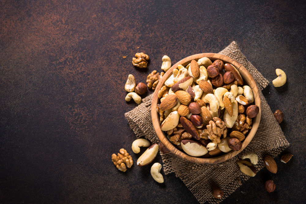 호두 100g당 3mg의 아연이 있으며, 아몬드는 100g당 4mg, 캐슈넛은 100g당 7mg, 호박씨는 28g에는 아연 2mg이 있습니다.